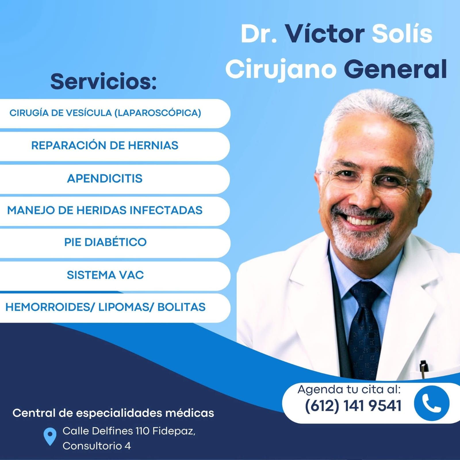 El DR. JOSÉ VÍCTOR SOLÍS SAMPERIO cuenta con más de 30 años de reconocida experiencia como cirujano en Baja California Sur, realizando diversos tipos de intervenciones quirúrgicas del tracto gastrointestinal, vesícula biliar, heridas complicadas, pie diabético, entre otras.